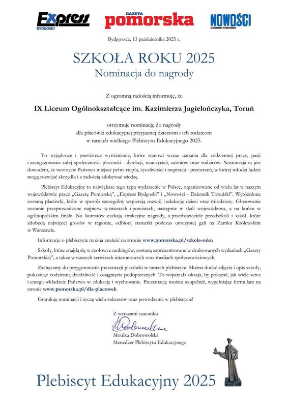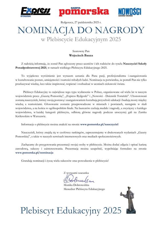 Kolejna nominacja dla naszej szkoły w Plebiscycie Edukacyjnym 2025!