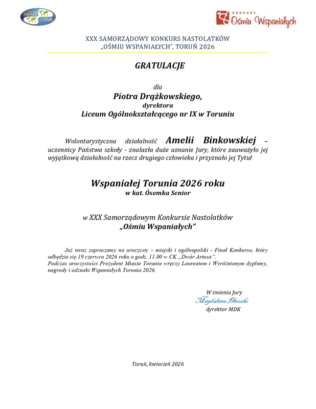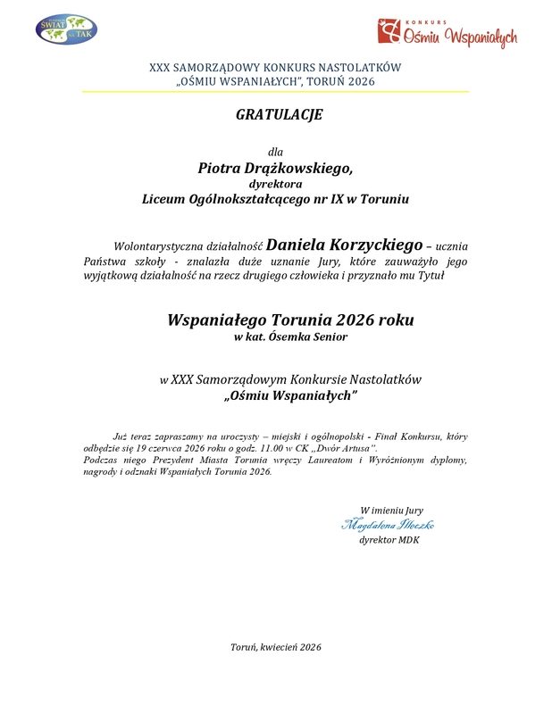 Amelia Binkowska i Daniel Korzycki laureatami XXX. toruńskiej edycji Samorządowego Konkursu Nastolatków "Ośmiu Wspaniałych".