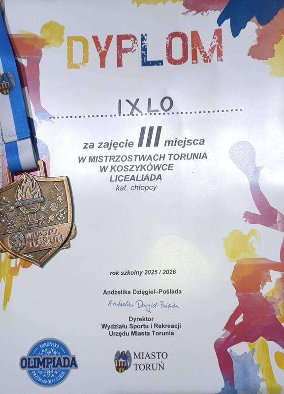 We wtorek 27 stycznia odbyły się mecze finałowe w koszykówce chłopców rozgrywane w ramach Toruńskiej Licealiady Szkół Ponadpodstawowych. W finałach wystapiły cztery najlepsze drużyny, które zwyciężyły w swoich grupach eliminacyjnych. Do gier finałowych zakwalifikował się również zespół IX Liceum Ogólnokształcącego, który zwyciężył w swojej grupie pokonując kolejno IV LO, III LO , ZS Technicznych i ZS Samochodowych i z kompletem zwycięstw zameldował się w finale . W półfinale finałów zespół "Kazika " po zaciętej grze przegrał jednym punktem z drużyną X LO , a w meczu o III miejsca pokonał 10-cioma punktami drużynę IV LO i zdobył brązowe medale. W drużynie: Błaszczęć Jakub 4A, Ćwikliński Sebastian 4A, Lewandowski Jacek 4C, Gencza Jakub 1E, Moszczyński Szymon 1B, Ciepłowski Oskar 3E, Straub Bartosz 3E, Poray Victor 3G, Grabowski Antoni 3F, Pilewski Jakub 3D, Karbowski Oskar 3A, Gościński Gabriel 1C i Dombrowicz Kajetan 3C. Zawodnikom gratulujemy i czekamy na więcej w przyszłym roku szkolnym.